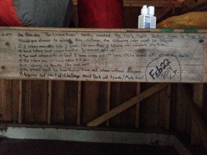Several of the youngsters, part of the self-styled group, “no parents, no bedtime,” found a challenge written in the shelter. The picture below shows the challenge, though the gist of it was that teams of two had to run BACK DOWN the mountain, hitch into Erwin, order two large pizzas face to face in the pizza shop, buy 24 cans of beer, then run back up the mountain in record time. Bloody crazy, if you ask me, but, incredibly, we soon had another team, from the “7am Crew.” The “vintage” hikers, including me, looked on as these crazy kids, on the stroke of 5pm, hurtled back down the trail.