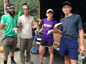 So there we were, ready to eat but not quite sure whether or not there would be pizza in a few hours. Hiker hunger took over, however, so the pots and pans were soon turning out noodles and soups. Amazingly, less than three hours after they left, all four returned with 4 pizzas and 48 cans of beer! It was stupendous and the signal for a party to begin. The teams are below; they are (left to right), Buchanan, True Story, Hawkeye and Science Tooth.